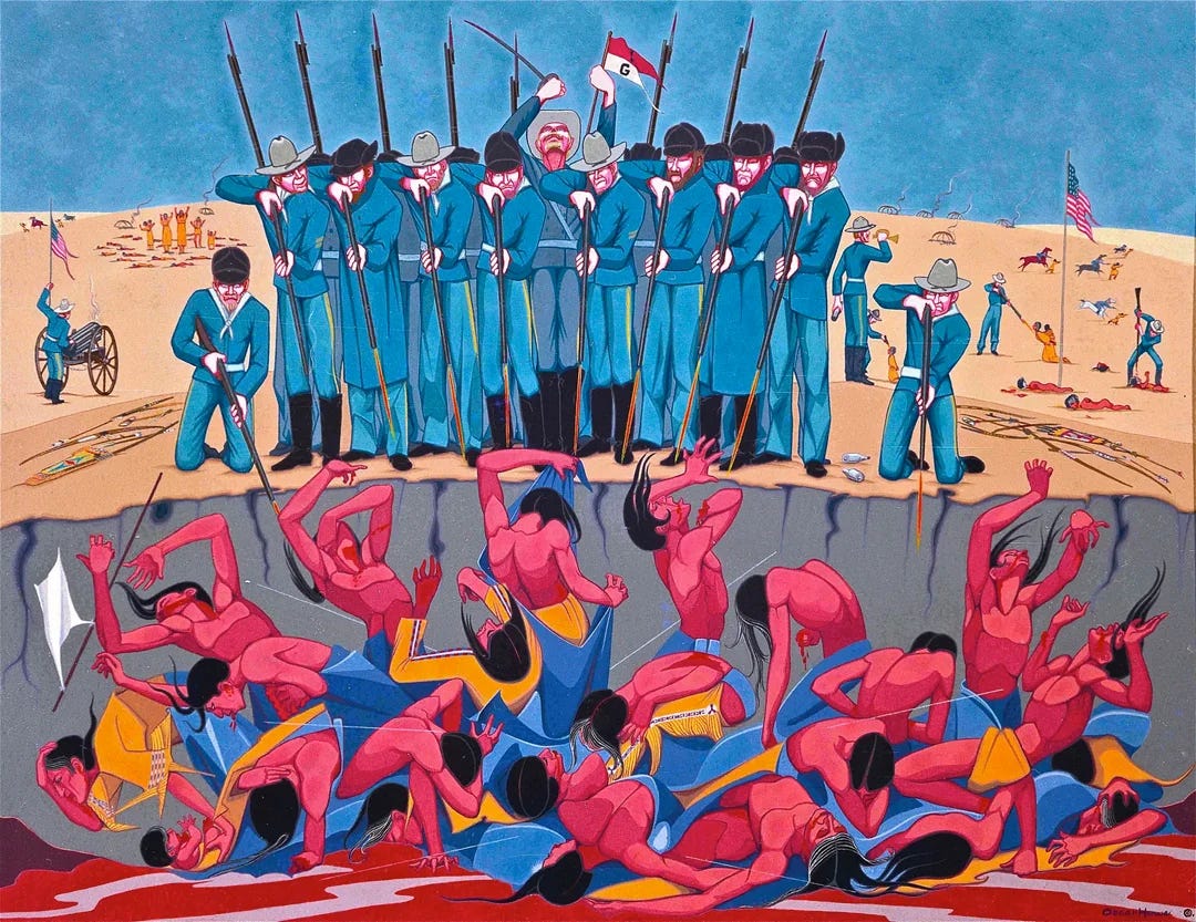 A deaf Lakota man, Black Coyote, hesitated to give up his rifle after the cavalry ordered all weapons to be confiscated. A shot went off in the struggle and the unspeakable horror began. Soldiers unleashed fire. Artillery from the Hotchkiss guns shredded tipis, horses and entire families. Survivors trying to escape were hunted down for hours throughout frozen ravines.