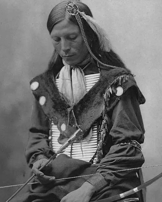 I started out alone on the old road that ran across the hills to Wounded Knee. I had no gun. I carried only the sacred bow of the west that I had seen in my great vision. I had gone only a little way when a band of young men came galloping after me. The first two who came up were Loves War and Iron Wasichu. I asked what they were going to do, and they said they were just going to see where the shooting was. Then others were coming up, and some older men.